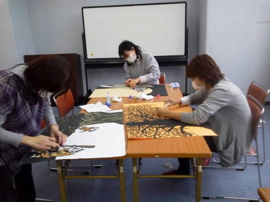 お金のない私達の事ですから、もちろん一から手作り。「モチモチの木」を滝平次郎さんの原画に忠実に切り絵で作り上げた大型紙芝居です。 カッターをいっぱい買って、ダンボールを使ったりカッター台を使ったり、自分専用の本格的カッターを買ったメンバーもいます!モチモチの木では、タイトル通り木がいっぱい出て来るので細かい枝を切るのがたいへんー!ってやる前には思うのですが、切り始めるとけっこうハマるのです。 メンバーに少しずつおすそ分け(?)してカットしてもらいましたが、楽しかった! もっと切りたくなった。という人がいて、内心ー良かった♪次回作も切り絵で行くぞ!ーと密かにガッツポーズしている、もいもいでした。 切り絵は、切った後も結構大変で、色を付けたり、細かいところにのりを付けて貼るのがまた一苦労。 それでも、一枚の絵に出来上がると惚れ惚れするくらい美しいのです。 これは、もちろん私達の腕前!ではちっともなくて、滝平さんの原画の素晴らしさのおかげなのです。 しかし、ここに難関が…!一番の見せ場、「モチモチの木に火がついた!」の場面。たった一言のこの場面が最も美しく、切り絵の黒と絵の具の色のコラボレーションが絶妙なのです。 こ、これをどうやって……。もいもいもお花紙と障子紙を使って…というところまでは考えたんですがね、メンバーのこれはちょっと大変でしょう!? もいもいは今、お仕事いっぱいだからね~。という、やんわりだけどしっかりのダメ出しで、この場面は美術監督さんの元へ。 のりは、どの種類が良いか、それを薄めて、はみ出たのりは、濡れタオルで拭き取って…と、美術監督さんの話を聞くうちに、「わー!!これもいもいの仕事じゃないねーやっぱりー」となりました。 さて、メンバーのみんなの家事を踏み倒しての努力によって出来上がった16枚の切り絵。 上部に、棒を通せるトンネルを黒い紙で付けて、番号を書いた棒を通して出来上がり♪ さらに、この紙芝居にはミラクルな事が待っているのですが、それは公演後のお楽しみ。 大型紙芝居は、人形劇と違って、3人いれば出来てしまうところが素晴らしい! 何とも人手不足の私達向けではありませんか!?当日、11月20日 (←ここ大事です) は第二小の図書室に満員の子ども達。 先生方もみなさん見に来てくださいました。そして、とっても楽しそうに集中して見てくれました。 場面が変わるたびにハッと息を呑む様子が伝わって来て、感激です。 特に美術監督が苦労した、火がついた場面では、子ども達から思わず「ワーッ」という歓声があがって、(うん、もいもいじゃなくて良かった…)って、ひとり突っ込みをしてしまいました。 本当にこの場面は綺麗です!! 読み終えて、モチモチの木に火がつく“霜月はつか”っていつかな?と読んだメンバーが聞くと、子ども達から「今日だよー!」「国語でやったもん。」との答え。 すごーい。子ども達から答えが来るとは思っていなかったのでビックリ! 昨年から、3年生の国語の教科書に載っているのだそうです。 ちっとも知らなかった。しかも、図書まつりが霜月二十日の当日だとは。 3日前の練習で気がついて、ゾクゾクしちゃいましたよ。 ずっと作りたかった「モチモチの木」、図書まつりの日は、3つの候補日の中から思い付きで選んだのです。 こんな偶然あるんだなぁ~って、感動しちゃいました。 しかも、3年生がちょうど勉強している内容だなんて!とっても嬉しいです。 もちろん紙芝居は、このあと3年生に貸して使ってもらう事にしました。 後で聞いたら、大きな「モチモチの木」で1年生に読み聞かせしてあげるのだそうです。涙が出ちゃうくらい嬉しいですねぇ…。 さて、公演の後には紙芝居の前で校長先生に記念写真まで撮ってもらい、子ども達にも「すごくきれい!」って誉められて、(もちろん紙芝居の事ですけどね)ご満悦の一座でした。 紙芝居の後は、図書クイズの当選者発表。クイズは、図書委員さんのお勧め本から選んだし、発表後本を手に取って確認している子もいました。図書委員さんによるクイズも盛り上がって、あっという間の楽しいひと時でした。 さて、これはおまけですが、写真を見ていただいて、今回の舞台は何で出来ているでしょう?(あ、またクイズだ…)人形劇の舞台を脚立と木の棒で作っているチームですから、推して知るべしですが、学校にある低いテーブルの上に椅子を2個乗せました。 はい、出来上がり!そうそう、紙芝居の棒が滑り落ちないように割り箸でストッパーをつけたのは、メンバーのその場でのアイデア。 さーすがドタバタ劇団!ですね。 何はともあれ、今回もめでたく滑り込みセーフ!ま、いっか~ ![]() by もいもい