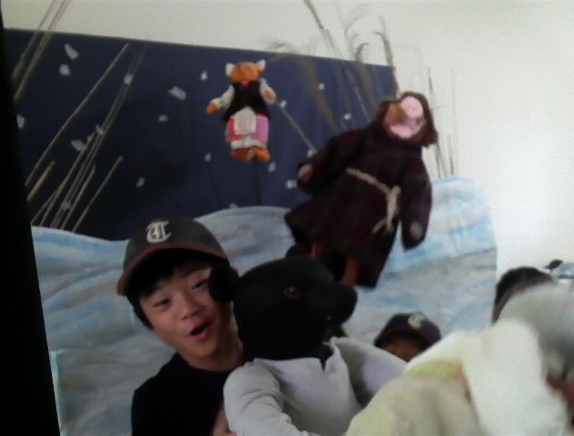 6作目最後の人形劇だから、自分たちの作りたいものをやろうね!って選んだてぶくろ・・・。 しかーし。今までにないくらいの試行錯誤!! 人形作りは思ったより大変でした ![]() ねずみの大きさが決まらなければ、かえるの大きさが決められない。 かえるの大きさが決まらなければ、うさぎの大きさが・・・それから、きつね、おおかみ、etc ・・・動物が出来なければ、てぶくろの大きさが決められない。 てぶくろが無ければ、入り具合いを確かめられない・・・ こういうのをなんて言うんでしょうね?! すっかりこの連鎖の壷にはまってしまった私たちは、実物てぶくろを使ったリハは、なんと当日 ![]() ![]() ここのスタート時間が午後でほんとーによかった ^^汗 でもですね、ふくろ状の布の中に棒つきの人形が7匹も入る??どのように?? ずっと、悩んできたポイントでしたがいろいろ超えなければならない課題があって、超えたつもりがてぶくろがヘタルー という結果になりまして、つっかえ棒とかつめものとか私たちのあるだけの脳みそを詰めまして・・・ 開演にこぎつけた訳です。流れは、まあまあ。 シンプルなお話ですからね。 子どもたちの好きな、繰り返しもの。 もちろん、子どもたちの好きな繰り返しもの! 子どもたちのね。 複雑な動きじゃなくてよかった~ ![]() もう、脳みそてぶくろに詰めちゃったから覚えきれないもん・・・ 動物がいっぱいに入って、ぎゅうぎゅうするところアドリブで「きついよー」とか「押さないで」とか入れようかと思っていたんですが、ぜんぶ子どもたちが言ってくれました。 見ながら、ワイワイと。 くまなんて、「ダメダメ、入れないよ。あっちいけ!!」的な扱いで、なにもそこまで・・・と思って聞いていたのですが・・・ 後でビデオを見て納得。 てぶくろに入っている動物があまりにもスゴイ! 舌をだらりとさせたオオカミはひっくり返り、その上にきつねが食べてくださいーな感じで自らの顔をオオカミの口に突っ込んでいる・・・ なんか修羅場な感じ。 子どもたちは、動物に激しく同情してくれたんですね。 なにはともあれ、終わったんです。 よし!? いつものように、舞台と人形を開放するとみんな待ってました!とばかりになだれ込んできて、おもいおもいの人形で遊びます。 2歳くらいの子が、うさぎを気に入って握りしめていました。 もう連れて帰っちゃうんじゃないかってくらいに・・・。 それでもいいですけどね。 次、うさぎ抜きでやるし! 気に入ってくれて嬉しいです。 バックは、とても綺麗でした。 この猛暑の中に、よくこんな涼しい雪景色を作り上げたものだ、これだけは拍手ーって思いました。 中景に使った雪山の水色がとてもよかった。 今回、いつも使ってる布や紙と併せて、自然の枯れ草や木の枝も使いました。 これがなかなかいい雰囲気を出していました。 この真夏に、枯れた葦や荻やススキを集めるのは、それはそれは大変でしたけどね。(冬から考えてたのに横着して取りに行ってなかった・・とかいう訳ではありませんよ。ぇぇと・・・) まず、リハーサルとしては良い出来でしょう!・・・あ、本番ですか? ![]() by もいもい |