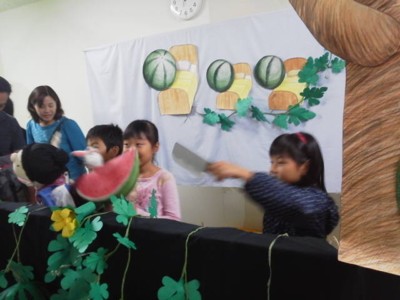 おはなしのたまてばこでは人形劇 ばばばあちゃんの『すいかのたね』で参加しました。 今回私は練習段階から参加できず、初めて観客として観ることになったんでが・・・。 何度もやって十分内容も解っているはずなのに、すっごく楽しかった こんなに楽しいものだったんですね!! 知らなかった~(^^;) 終わったあと、あ~面白かった~!って言ってた子がいて、うんうん、そうだよね、そうだよね!って一人で納得。 いやいや、一人ではなくきっと観客の全員そう思ってくれていたはず♪ 実は今回は私を含め古参の2人が参加できず、きっとメンバーの皆さん不安だろうなと心配していたんですが、どうして、どうして、不安なんてどこへやら! 今まで何度か参加していただいて、ここにきて自信が出てきたのでは?? メンバーのお子さんも手伝ってくれて、頼もしいかぎりです。 終了後は恒例の人形であそんでみよう~♪ 子供たちはみんな興味深々。 やってみたいって子も現れましたよ(^^) ぜひ、ぜひ、参加してくださ~い。お待ちしていま~す。 |