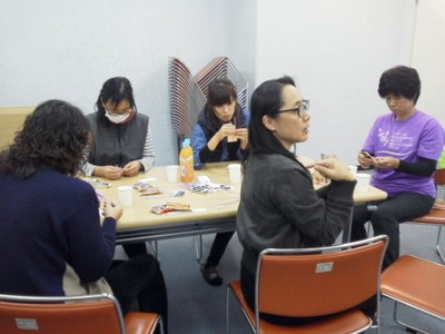 みなさん、子供達にプレゼントするしおりをせっせを作っていますが、どうやらしおりに付けるリボンの付け方が難しいようで・・・ ネクタイ結び・・・これなら絶対あとで取れたりしないよ、とメンバーさんが見つけてきてくれたアイデアです。 でも、普段ネクタイなんか結んだりしないメンバーさん達にとっては、これが意外と難しい・・・(^^;) さて、頑張って結んでいるメンバーさんを横目に、私は初めて見る紙芝居の出来に感嘆の声を連発!! 私としては素材として提供している部分が多かったので、こうやって作品として目にするのは初めて。 心配したマーブリング素材も実際の絵本とはちょっと違うけど、絵本の雰囲気を壊すことなく綺麗にハマってくれています❤ 読みの方もなかなかいい感じです♪ BGMもバッチリ! ちょっとだけ手を加えていい雰囲気で終われそうです(^^) 第二小の皆さん、11日の図書祭りにはアレクサンダと一緒に紫の小石を探してね~❤