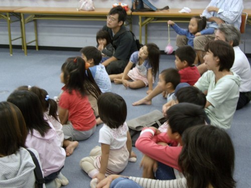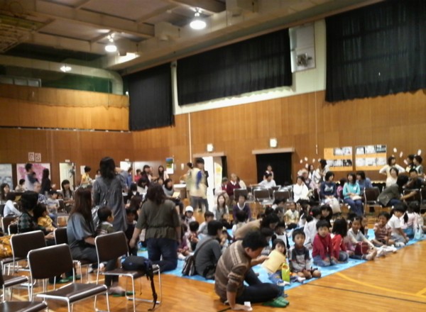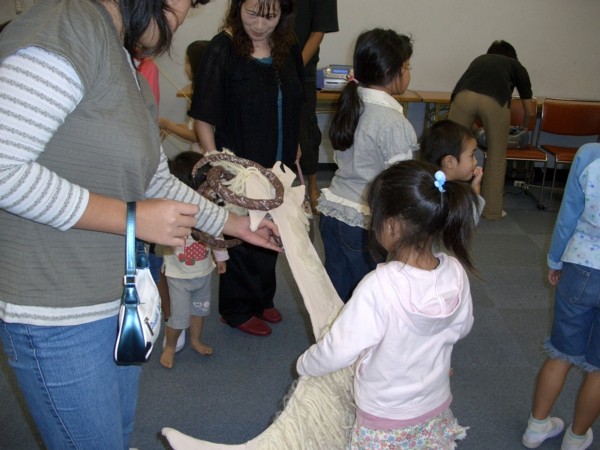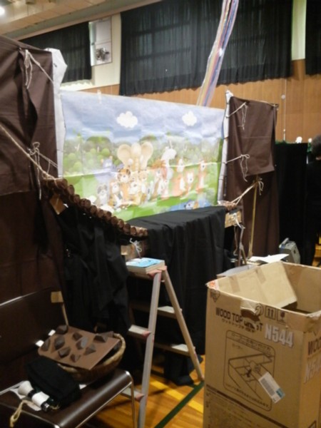 昨年一度、ご一緒させていただいた縁で、子育て支援サークルのなごみさんの10周年イベントに「おはなしのたまてばこ」も人形劇で参加させていただきました。 演目は、9月に公民センターのお話会でもやらせていただいた‘三びきのやぎのがらがらどん‘ スタッフは、5人。 koba、naka、sumiは11時から大道具、小道具を運び、なごみさんと打ち合わせしたり、舞台のセッティングをしたり。 人形劇初参加のあっきょは、用事を済ませて12時には駆けつけてくれ、私は午前中仕事のため、1時オープンイベントだと言うのにほぼ1時に滑り込み・・・ 複合センターのレクホールいっぱいの会場に、さまざまな展示や喫茶コーナー、(あたりまえだけど)たくさんのお客さん。 このイベントの規模の大きさに、なごみさんのこの企画にかける意気込みに、今更ながら感心し、とっても緊張する。 これに参加するのか・・・わたしたち・・・フーン、すごい・・・いや、人ごとじゃなく、もう始まってるし。 最初は、おはなしぱぴぷぺぽさんの‘ブレーメンの音楽隊‘。ひとがやってくれるのを見るのはとっても楽しい! 二番目は、白井子ども劇場の方がひとりでエプロンシアターを。しかけのアイディアがとってもおもしろい。アイスにかぶりつきたそうな子が出てきたけれど、その子の気持ちよくわかる・・・。 さて、いよいよ出番!ますます緊張してきた。初めての場所っていうのはこうなんだなきっと。しかも自分でセッティングをしていないものだから、飛び入り参加みたいな気分で何か落ち着かない。 他のスタッフもこの場でリハーサルをやっていない事で、ちょっと緊張気味みたい・・・。まして、シナリオ上で今日説明を受けただけの初登場あっきょは、大変だったとおもう。デビュー戦、こんな大きな会場で。 今回のトロルの目玉ですが、今日こそは直前になって縮まないように念入りに、前もって念入りに、おしゃべりしながら念入りに・・・空気をシュポシュポ入れてたら、入れすぎました!! トロルの目にぴったりはまり、ちょっと押したくらいでは動きません。-つまり、目玉パンチで飛び出しません。^^ ハイ、大ヤギとの格闘シーン迷わず手で取って放り投げました。スミマセーン 片方の目は、パンチでうまく飛んだと思っていたら、やぎ担当のsumiから、「目玉ひとつ私に当ったわよ。」って、ふたたびスミマセーン ![]() ほかにも、やぎの毛糸に別な小道具の針金が絡んでやぎの出が遅れ(それをつけたままでは、とってもヘンなので)ナレーションがアドリブで場つなぎをして、いやー録音じゃなくて良かったね、とか、いつもながら本番ならではのお楽しみ(?)満載の公演でした。 終わってから、三びきのやぎを持って子ども達の前に出るとみんなとっても喜んで撫でにきてくれました。(引かれるといけないので、打ち合わせ通りトロルはやめておきました) 控え室で他グループの方とお話し出来たのも楽しかったです。手作りの人形や、懐中電灯を使った照明を褒めていただき、嬉しかったのですが、ますます演出家がほしーいと思ったのでした。 なごみさんには、飲み物や手作りケーキの差し入れまでいただき有難うございました。当日バタバタしていて、ゆっくりお礼も言えずざんねんでしたが、これからも素晴らしい活動でがんばって欲しいと思います。