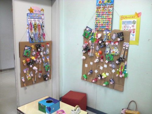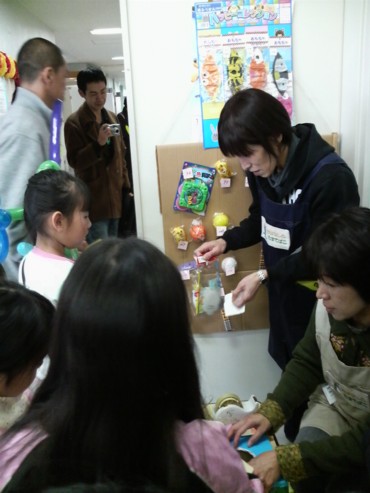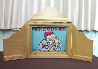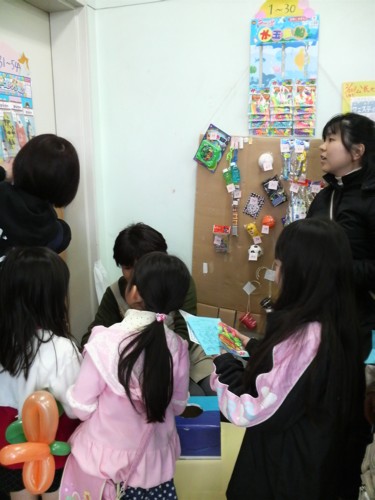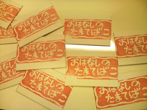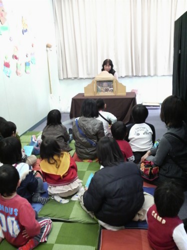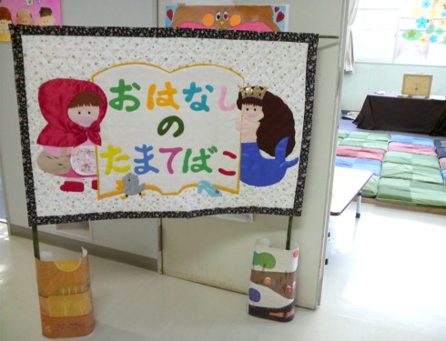 ★2月22日(日)に地区の公民センター祭りに、おはなしのたまてばこも参加しました。 テーマは『懐かしの紙芝居』 ★・・・と張り切って、近所の大工さんに拍子木まで作っていただいたのですが、みんな紙芝居を読むのは初めてに近いので、別の日に集まって読み聞かせ合いをしたり、時間を計ったり・・・。紙芝居の抜き加減や、抜いた絵をさりげなく枠に入れるのが難しかったですねー。 でも紙芝居って、枠の中に入るとすごく雰囲気が出ていい感じですね。 ★この際、以前から作ろうと思っていた、たまてばこの看板もがんばってみんなで作りました。 ★パッチワーク風のタペストリーになっています。これは、sumiとkobaの合作!やっぱり隠れた業を持つ人はすごいですね。助かりましたよー。 構想も10年越しなら、使われてる布もそのくらい眠っていた物のようで、とにかくメデタシかな!? ★懐かしの・・・ということで、おもちゃの景品もそろえました。 駄菓子は隣のコーナーでお菓子のつかみ取りをやるというので、たまてばこでは、おもちゃのくじ引きにしました。 ★sumiと一緒におもちゃや駄菓子の問屋さんに買い出しに行った時、あれもこれも欲しくて目移りしたあげく‘おとな買いー!!’とひとパックまるごと自分用のきな粉棒を買って喜んでいたのは私(もいもい)です^o^ ★お部屋に入る時、紙芝居が終わった後、おもちゃのくじ引き券と引替の入場券をもらいます。 これはもいもいさんが頑張って、消しゴムハンコで作ってくれました。 ちょっとレトロチックでいいですねぇ(^^) ★sumiとkobaに大作のタペストリーを任せて、私が作っていたのはこ・れ・だ・け! 当日の朝20分で出来ましたよ。「もいもいって、いっつもギリギリになってからやるよねー」とは、耳が痛いメンバーからのアドバイス?? ★おもちゃが目当てかどうか(^^;)大入りで盛況でした。 懐かしい~って言って、大人の方も見に来てくれたのはとても嬉しかったです。 ★座布団を敷き、隣との仕切りには黒い布をかけた狭めの空間は居心地が良かったみたいです。私たちも、合間の時間にはつい座ってしまいました。 素敵な出会いもありました。人形劇が好きな大人の方が、このイベントの紙芝居を見るためにわざわざ来てくれました。 もちろん!くじ引きも子供たちは大喜び。 4回の上演に何回足を運んでもいいので、お目当てのおもちゃを当てそこなった子は、何度も見に来てくれたりして(^^) 親の世代は紙芝居が懐かしいって思うんだけど、子供たちにとっては新鮮なのかな?? 4回の公演で大人子供合わせて90人ものお客さんが来てくれました。 失くしたくない日本の文化、次代に伝えたい郷愁。 読み聞かせとともに、真剣に取り組んでみたい課題です。 ・・・・・by moimoi & sumi PR