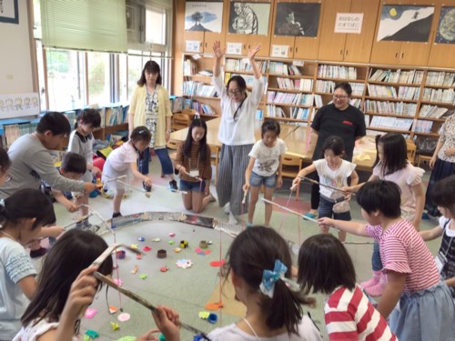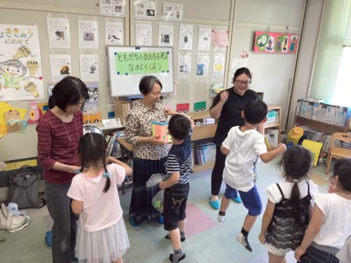 内容は紙芝居、絵本の読み聞かせ、体操、つりゲーム、くじ引きで盛り沢山。 紙芝居は『ねずみきょう』『ひこいちどんのかさやさん』 1年生が多くとっても賑やか! みんな明るくて素直ないい子達でした(^^) 絵本『うみやまがっせん』 ページごとに動物や海の生き物たちが、綱引きの加勢にやってくるお話ですが、その度に男の子たちの声が上がって、最後にはツッコミまで入れられてしまいました(^^;) かがくい ひろしさんの絵本『だるまさんが』で、笑い転げながら、楽しくみんなで体操~♪ つり糸に磁石を付けた竿でつり競争! 池の中のお魚はメンバーが作った自慢の折り紙。 お魚だけじゃなく、動物や箱やお花、いろいろあるよ~。 最後はじゃんけんで勝ったもん順のくじ引きです。 何がもらえるかお楽しみ(^^) 今回も楽しい一日が過ごせたと思います。 子供たちが喜んでくれたのがなにより! 皆さんお疲れさまでした~