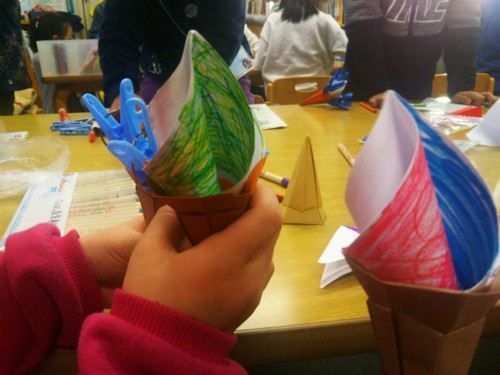 始まる前はあまり反応がなく、はたしてうけるのか??と心配しましたが、いざ始まってみるとかなりの大うけでした(^^;) とくにがまくんがアイスクリームだらけになって登場したところがクライマックス! 子供たちは大騒ぎでした。 アーノルド・ローベルのかえるくんとがまくんシリーズは小学校国語の教科書にも載っている作家さんなので、これをきっかけに興味をもってくれると嬉しいです。 そのあとはみんなで折り紙のアイスクリームを作りました。 持ち手のコーンはちょっと難しいので、たまてばこのメンバーでせっせと折りました。 子供たちにはアイスクリームの折り方を教え、デザインもやってもらいました。 みんな夢中になって作ってくれましたよ ♪♪ どんなアイスクリームが出来上がったでしょうか! それぞれバラエティにとんでいて、とっても美味しそうでした!❤❤ このアイスクリームコーンは難しいですが、コーンの形が本物っぽくて大人の方にも大変好評でしたので、折り方のサイトをご紹介しておきます。 アイスクリームコーンの折り方はこちら PR