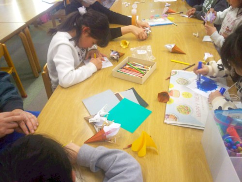 小さいお子さんとお父さん、お母さんがゆっくりくつろげるお部屋がテーマです。 イベントを見て回って疲れたお子さんと親ごさんが、まったりしていただけるお部屋になってます。 絵本のコーナーやさかな釣り、的当て、おえかき、ぬりえ、折り紙を自由に楽しんでいただきました。 お魚はメンバーでがんばって折り紙で作りました。 釣ったお魚は5個までお持ち帰りできます。一番人気はチンアナゴ。 思ったより沢山の子たちが遊んでくれて・・・途中でお魚が足りなくなり、急きょ焦ってその場で折りまくりました(^^;) 80人以上は遊んでくれたので、5x80=400!! お魚400個以上も折ったの?~~~ 疲れた~~ 的当てはお手玉を動物さんのお口へ投げ入れるゲームです。 みんなとっても上手でしたよ ♪ ♪ 今回は手作りしたものが多く大変でしたが、子供たちがとっても喜んでくれたので、疲れも吹き飛びました。 メンバーの皆さんもこれからイベントが続きますが、体調を崩さぬように、がんばりましょう。 お疲れ様でした~❤
