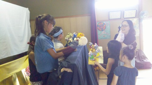 今年は『おむすびころりん』 参加人数が少なかったので、はたして出来るかな??って思ったけど、1人何役も兼ねて何とかやりきりました。 やれば出来るもんですね(^^;) 公演後のいつものお楽しみ ↓ みんなもやってみよう~! 今回はもいもいさんが感想をくれました ↓ 中の子ども会、5人で可愛い(?)声でおむすびころりん 子ども達からは、おむすびを落とすと「あー!?もったいない!!」 ねずみの国になったら宝物を見て「竜宮城だ!」 おばあさんが出て来ると、「かわいいおばあちゃん!シミがひとつもない!」など、突っ込み満載でしたが、多少のトラブルを乗り越え、無事に終了しました by もいもい メンバーの皆様、暑い中お疲れ様でした。『おむすびころりん』は9月にもう一度、「きらりフェスタ」で公演します。 暑い日が続きますが、もう一踏ん張り! 頑張りましょう~!